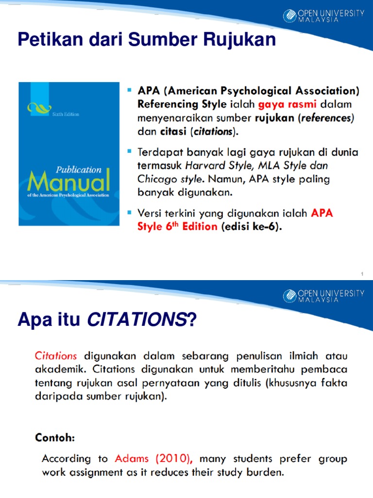 Petua Menulis Cara Mudah Mencari Rujukan Di Internet. Kaedah 2 dari 3. APA American Psychological Association Referencing Style ialah gaya rasmi dalam menyenaraikan sumber rujukan references dan citasi citations.